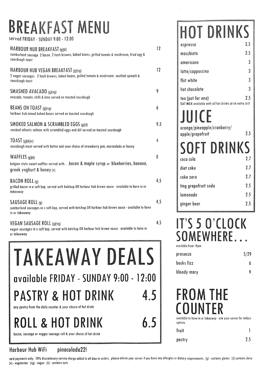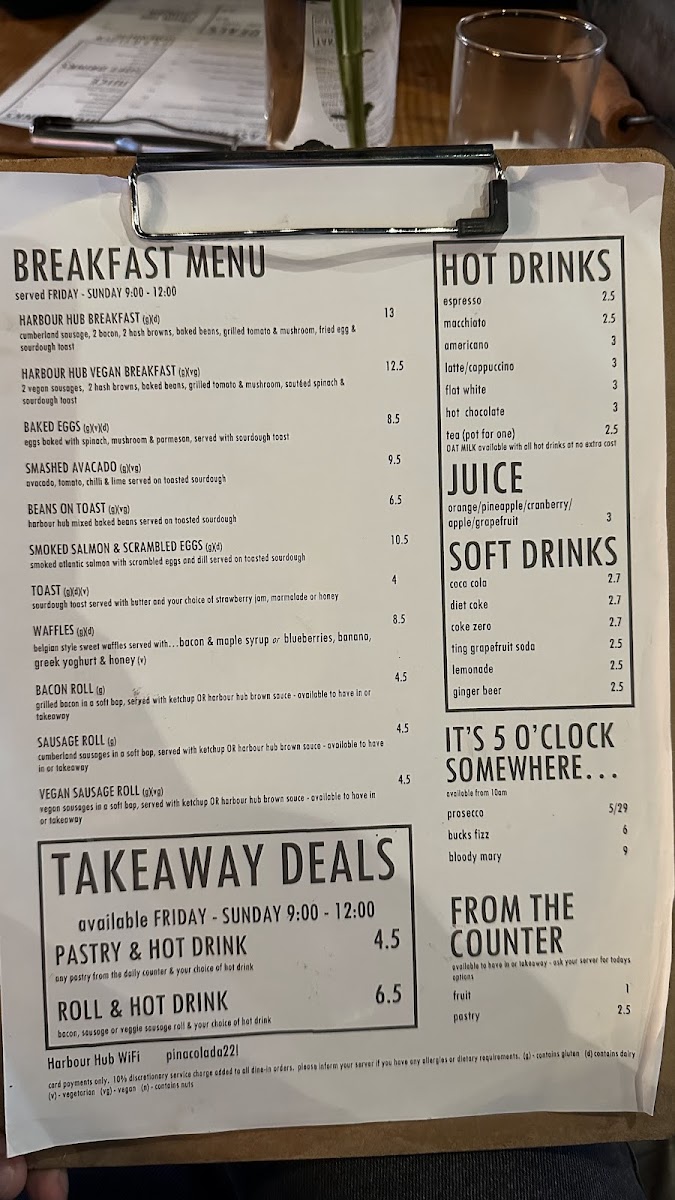 The menu offers a tempting selection of dishes, with standout choices like the fish and chips, hailed for its crispy exterior and tender, juicy fish. For breakfast enthusiasts, the Harbour Hub Breakfast and Vegan Breakfast present hearty options, alongside lighter fare like smashed avocado and waffles.
